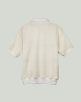 White Loose Textured Polo Neck Knit With Open Placket & Ribbed Hem.