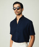 Navy Blue Bamboo Classic Shirt With Buttondown Collar & Pintucks At Sleeve Hem