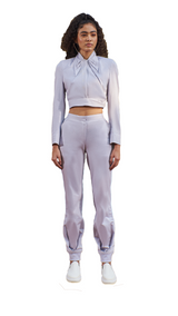 Jacket: The Concept Ash Grey Crop Jacket has high manipulated peak collars. It also has a concealed zipper placket and an adjustable belt accent on the hem to complete the look. The jacket incorporates an S curve piping on the back, which is a signature feature of this line.
