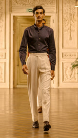 Navy mandarin collar shirt with tonal s-line embroidery at front