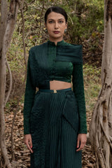 Fully Embroidered Emerald Green Bandhgala Blouse with attached Micro Pleated Embroidered Drape along with Heat Set Pleated Saree Gown Skirt