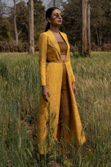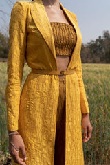 FULLY MANIPULATED MUSTARD TUBE TOP WITH MUSTARD SLIM-FIT TROUSER ALONG WITH FULLY EMBROIDERED LONG YELLOW JACKET