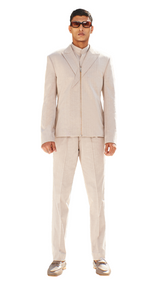 Jacket: The Concept Mock Lapel Nude Ensemble is a double-breasted jacket with faux peak lapels and piping of the significant S curve on the back. The zipper is center front-opening, even though the lapels end on the other side.
