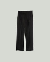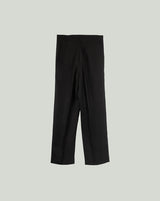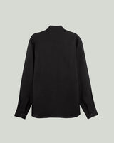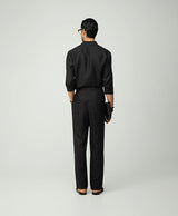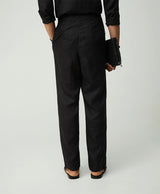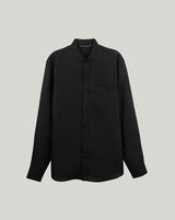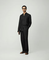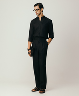Black Linen Shirt With Mandarin Collar And S Shaped Welt Pocket Paired With Black Linen Extended Waistband Trouser