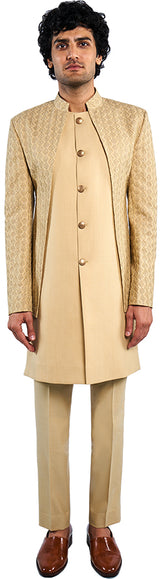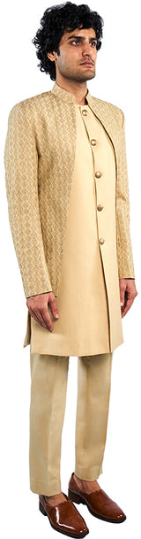 Beige Fully Embroidered In Gold Zari And Resham Open Sherwani Jacket With Bandi And Trouser