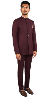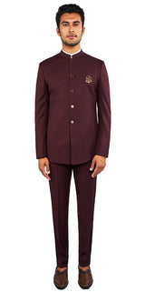 Worsted Wool Burgundy Bandhgala With Curved Pintucks On Hem Paired With Burgundy Extended Belt Two Button Trouser