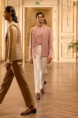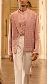 Dust pink diamond lapel open bandi with diamond manipulation in front & horizontal box pleats at back