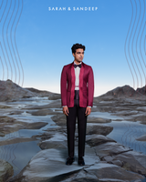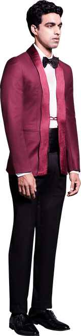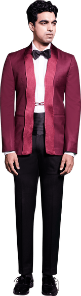 Maroon Tuxedo with Curved Pintuck Detail on Satin Lapel Paired with White cotton shirt, Black trouser, Satin pintuck detailed Bow tie and Satin Cummerbandh.