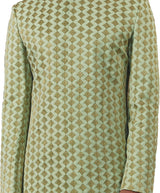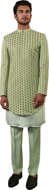 Fully Embroidered Worsted Wool Mint Green Sherwani With Curved Hem Paired With Yoke Embroidered Mint Kurta & Mint Green Trousers