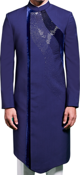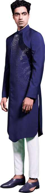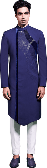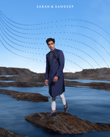 Navy Curved Hem Blue Sherwani with Sali, Cutdana Embroidery and Velvet Detailing Paired with White Dupion silk Slim fit trouser.