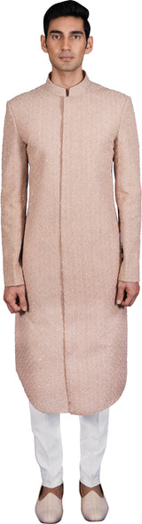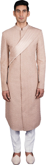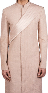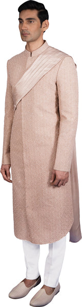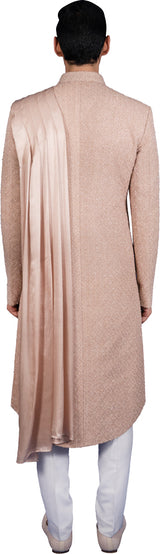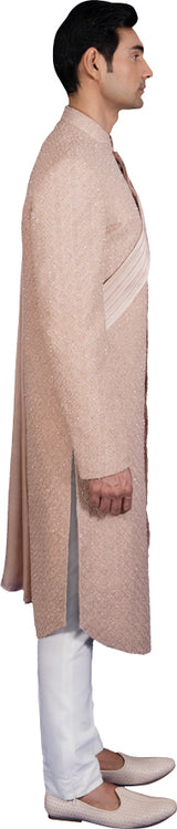 Rose Gold Sherwani In Dori, Zari And Bead Embroidery With Pleated Shawl And White Cotton Silk Trouser