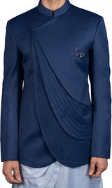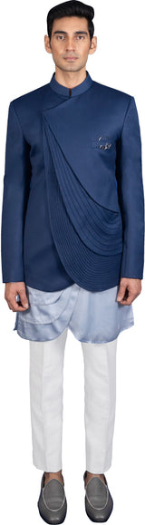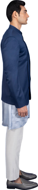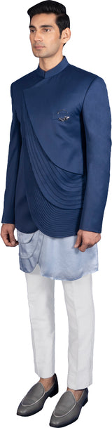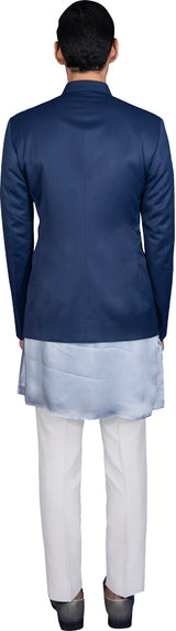 Royal Blue Bandhgala With Pin Tucks On Mock Flaps Paired With Blue Kurta With Silver Zari Embroidery On Mock Flaps And White Cotton Silk Trouser