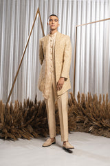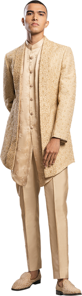 Wavy Lapelled Gold Embroidered Sherwani & Kurta with Centre Pintucked Gold Trouser.