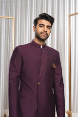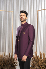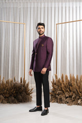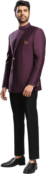 Embroidered Single Lapelled Plum Bandgala with Centre Pintucked Black Trouser