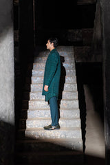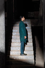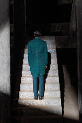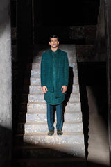 Green fully embroidered open sherwani with extended curve lapels & high-low hem.