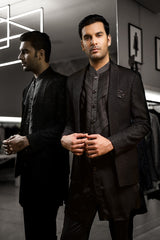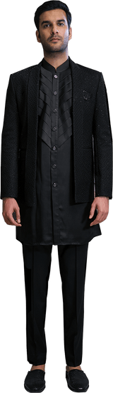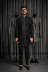 Black Embroidered Jacket & Bamboo Pleated Kurta with Centre Pintucked Charcoal Black Trouser.