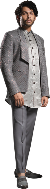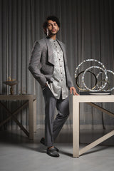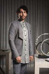 Angular Lapelled Grey Embroidered Jacket & Kurta with Centre Pintucked Grey Trouser.