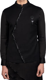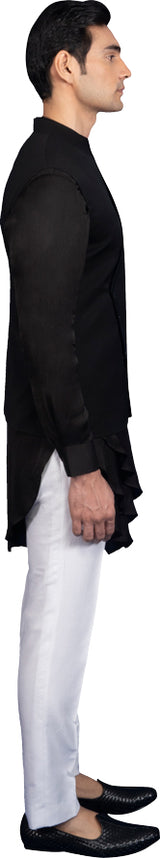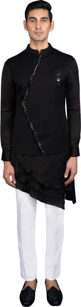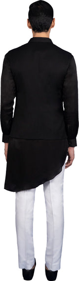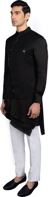 Black Bandi With Herringbone Bead Embroidery Paired With Black Modal Silk Kurta With Mock Flaps At Hem And White Cotton Silk Trouser