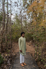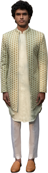 Mint Fully Embroidered Open Sherwani with Curved Hem