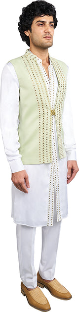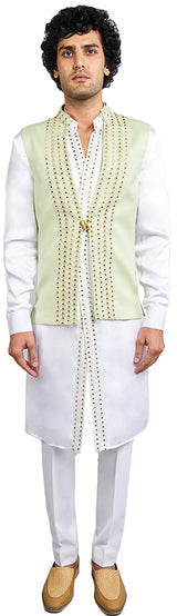 Mint Green Bandi With Gold & Zari Geometric Embroidery Paired With White Placket Embroidered Kurta & White Cotton Silk Trouser