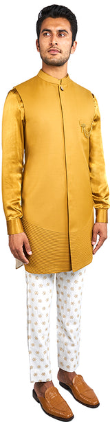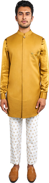 Mustard Long Bandi With Curved Pintucks At Hem Paired With Mustard Kurta With Curved Pintucks & Cotton Silk Trouser