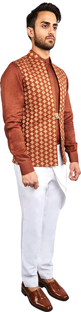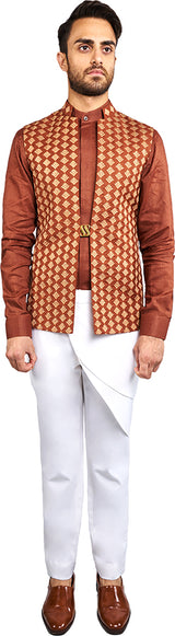 Rust Bandi With All Over Gold Zari Machine Embroidery Paired With Rust Linen Shirt