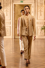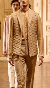 Beige Fully Manipulated Open Bandi With Diamond Lapel.