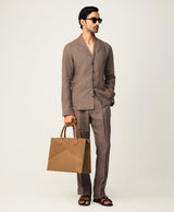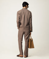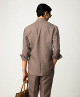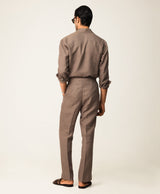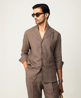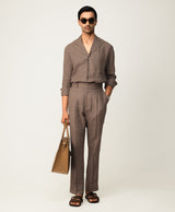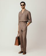 Taupe Linen Resort Collar Shirt With Radient Pintucks On Collar Paired With Taupe Linen Trousers With 2 Buttoned Up Extended Waistband