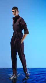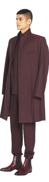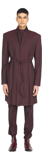 The Ensemble is composed entirely of polyester and is both waterproof and breathable, ensuring a comfortable fit. The Burgundy Ensemble is a three-piece safari jacket and an overcoat. The Safari Jacket has a front zipper with a snap button closer and a high collar. Also, it has two chest pockets and two stomach pockets with box pleat detailing. The mid thigh-length overcoat has a chest pocket and signature manipulation detail on the collar. It has three button opening with inverted pleats on the front. The overcoat has keyhole detail with box pleating at the bottom with a two button detail. The NBA style trouser has front pleating and two concealed side pockets.