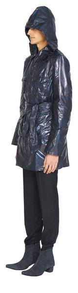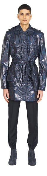 The garment is composed entirely of recycled nylon and is both water-resistant and breathable, ensuring a comfortable fit. The Unisex Holographic Safari Jacket is a mid-length jacket with a front zipper opening. The jacket has two chest pockets and two stomach pockets with 'S' curve pocket flaps. The S-shaped belt has our signature pintuck detailing. The jacket comes with a detachable hood and a back vent for easy movement. The signature 'S' curve detailing on the back with piping elevates the overall look of the multi-functional detailed Safari Jacket.