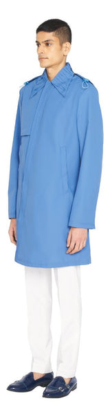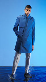 The garment is composed entirely of polyester and is both waterproof and breathable, ensuring a comfortable fit. The Sky Blue Trench is a knee-length trench with an asymmetrical pintuck detailed placket with a zipper opening. The collar of the garment has our signature manipulation making it a style quotient. There is a hidden pocket under the concealed zipper flap on the front right side of the Trench. The trench has concealed zipper stomach pockets. The sleeves on the trench have concealed zipper pockets for multi-utility purpose such as keeping cards or keys safely. The Trench comes with a detachable hood and a back vent for easy movement. The signature 'S' curve detailing on the back with piping elevates the overall look of the multi-functional detailed trench coat.