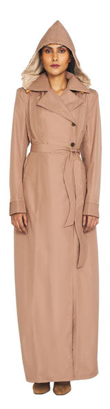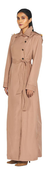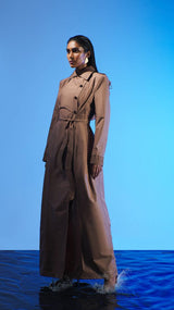 The garment is composed entirely of polyester and is both waterproof and breathable, ensuring a comfortable fit. The Brown Trench is an ankle-length double-breasted trench with a convertible lapel for different variations of the garment. The collar has our signature pintuck detailing similar to the cuffs. The trench has two side concealed zipper pockets with a hidden pocket on the right side. The sleeves on the trench have concealed zipper pockets for multi-utility purpose such as keeping cards or keys safely. The Trench comes with a detachable hood and a back vent for easy movement. The signature 'S' curve detailing on the back with piping elevates the overall look of the multi-functional detailed trench coat.
