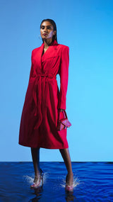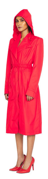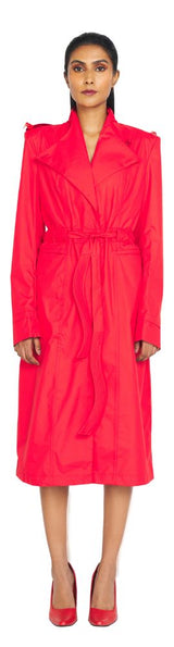The garment is composed entirely of polyester and is both waterproof and breathable, ensuring a comfortable fit. The Red Trench is a calf-length trench with a front concealed zipper opening and a convertible lapel for different variations of the garment. It also has signature manipulation on the waist with an 'S' shaped belt. The Trench has two concealed zipper pockets. The sleeves on the trench have concealed zipper pockets for multi-utility purpose such as keeping cards or keys safely. The Trench comes with a detachable hood and a back vent for easy movement. The signature 'S' curve detailing on the back with piping elevates the overall look of the multi-functional detailed trench coat.