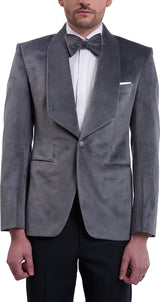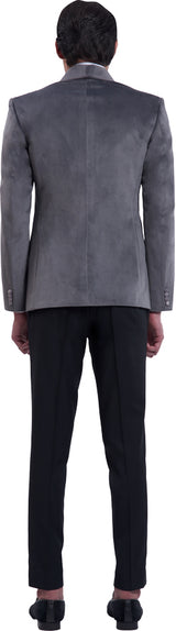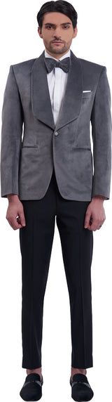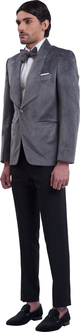 Grey velvet dinner jacket with concept shawl collar with black trouser