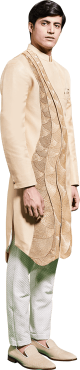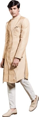 Gold Sherwani With shades of Gold Cutdana Embroidery & Zari Embroidery on Curved Panels Paired with White Embroidered Dupion Silk Trouser.