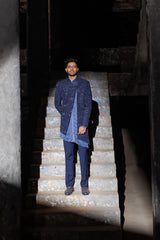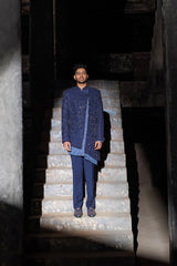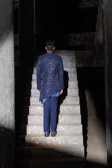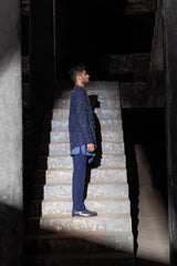 Navy fully embroidered collarless jacket with assymetric cut at centre front & hem.