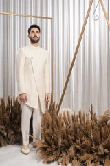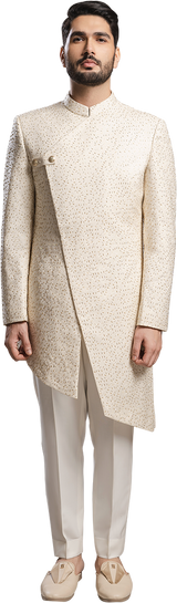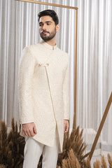 Beaded Ivory Assymetric Sherwani with Centre Pintucked White Trouser