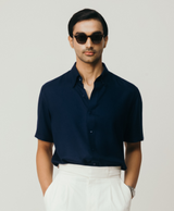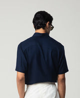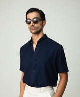 Navy Blue Bamboo Classic Shirt With Buttondown Collar & Pintucks At Sleeve Hem