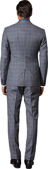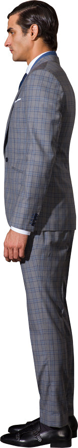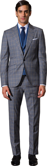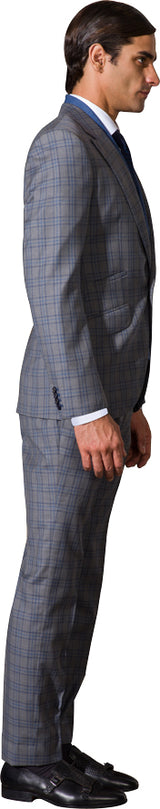 CB Canvas Light grey & dark navy blue checks 3pc suit with Classic blue micro check 4 button shawl lapel waistcoat