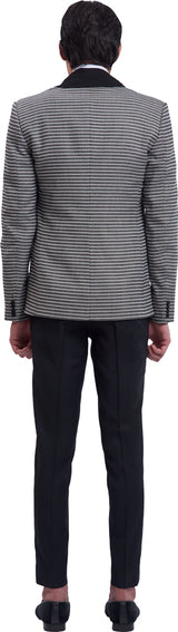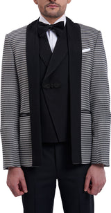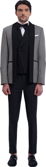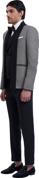 Black open jacket with extended straight pintucked collar & waistcoat with pintucked shawl lapel with black trouser