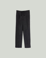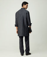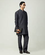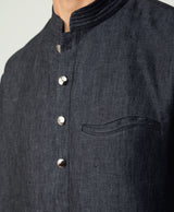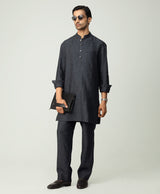 Dark Grey Slub Linen Kurta With Half Placket Pintucks At Collar & S-Chest Pocket, Paired With Relaxed Drawstring Trousers
